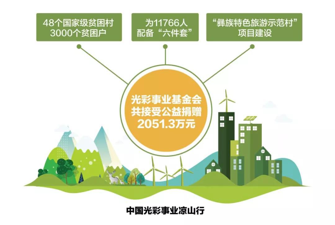 随后,“中国光彩事业凉山行”在四川凉山州举行。光彩事业基金会共接受公益捐赠2051.3万元,为昭觉县和美姑县的48个国家级贫困村3000个建档立卡贫困户共11766人配备生活必备设施“六件套”(钢制储物柜、钢制碗柜、钢制衣柜、钢制餐桌1张+钢木结构椅子6把、32寸电视机1台、20管太阳能热水器1台),剩余资金用于昭觉县尼地乡署觉洼乌村“彝族特色旅游示范村”项目建设,以促进凉山地区精准脱贫,推动社会和谐发展。