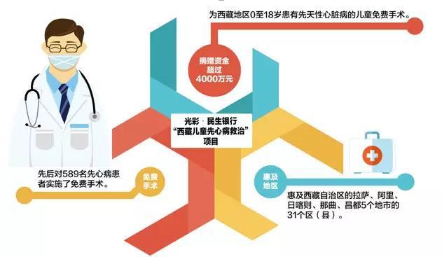 先天性心脏病是许多贫困地区孩子带给自己和家庭的先天重压。昂贵的医药费和复杂的手术技术往往是他们获得救治的瓶颈。2013年在“中国光彩事业西藏行”活动期间,中国民生银行与中国光彩事业基金会共同发起实施“光彩民生银行西藏儿童先心病救治”项目,捐赠资金超过4000万元,为西藏地区0至18岁患有先天性心脏病的儿童免费手术。项目启动以来至2018年12月,先后对589名先心病患者实施了免费手术,惠及西藏自治区的拉萨、阿里、日喀则、那曲、昌都5个地市的31个区(县)。得到群众广泛认可,使受助家庭感受到了来自党和政府、企业、社会组织的关怀,促进了民族融合。