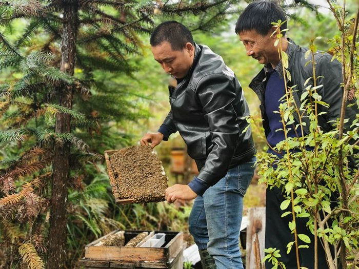 蜂农在楠木庄深山蜂场里开新鲜蜂蜜给客人品尝